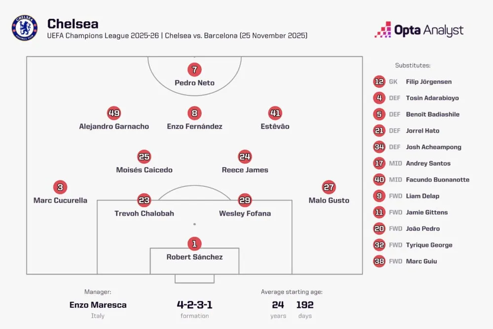 Những cầu thủ tấn công như Pedro Neto, Alejandro Garnacho, Jamie Gittens, Liam Delap (người vừa ghi bàn đầu tiên tại Champions League) và thần đồng Estêvão đều đang vào phom. Ở tuyến giữa, hai bản hợp đồng đắt giá nhất câu lạc bộ, Enzo Fernández và Moisés Caicedo, đang thi đấu như những cầu thủ đẳng cấp thế giới.1 Fernández, dù bị từ chối hai bàn thắng trong trận gặp Barcelona, đã tham gia vào nhiều bàn thắng nhất kể từ sau Club World Cup. Trong khi đó, Caicedo đang khẳng định mình là một trong những tiền vệ thu hồi bóng hay nhất hành tinh. Sự lãnh đạo của những cầu thủ thâm niên hơn như Reece James và Marc Cucurella đang trở nên vô giá.