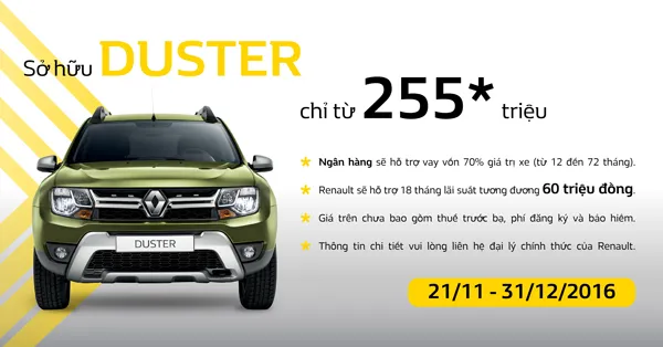 Từ ngày 21-11 đến ngày 31-12-2016, chỉ từ 255 triệu đồng, khách hàng sẽ sở hữu ngay xe Renault Duster tương đương 30% trị giá xe, 70% còn lại ngân hàng sẽ hỗ trợ (từ 12 đến 72 tháng). Renault sẽ hỗ trợ 18 tháng lãi suất tương đương 60 triệu đồng. Giá trên chưa bao gồm thuế trước bạ, phí đăng ký và bảo hiểm. Khách hàng không mua qua ngân hàng sẽ được giảm giá xe trực tiếp 60 triệu đồng. Chương trình áp dụng 80 đơn hàng đầu tiên. Hiện giá thị trường của xe Renault Duster là 849 triệu đồng.