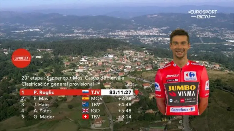 Tay đua người Slovenia đã cầm chắc chiếc áo đỏ của giải năm nay với thành tích 83 giờ 11 phút 27 giây, hơn người thứ hai Enric Mas đến 2 phút 38 giây. Nếu không có bất ngờ quá lớn ở chặng cuối thi đấu cá nhân tính giờ 33,8km, Primoz Roglic sẽ lần thứ hai liên tiếp đăng quang cuộc đua này.
