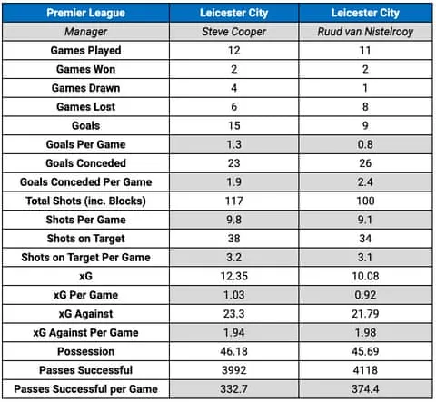 Dưới thời Steve Cooper, Leicester đã gặp khó khăn ở cả hai đầu sân. Họ có chỉ số xG (số bàn thắng kỳ vọng) thấp nhất (13,72) theo Opta, với số lần dứt điểm trung bình mỗi trận ít nhất (9.8) tại Premier League khi Cooper bị sa thải vào ngày 24 tháng 11. Đồng thời, họ cũng có chỉ số xGA - bàn thua dự kiến - cao thứ ba (26,6). Chỉ có hai đội để lọt lưới nhiều bàn hơn Leicester (23) hoặc để đối thủ dứt điểm nhiều hơn mỗi trận (17.6). Trong hầu hết các chỉ số chính, từ điểm số trung bình mỗi trận (0,64 so với ,.08 của Cooper) đến xG, Leicester đều tệ hơn dưới thời Van Nistelrooy.