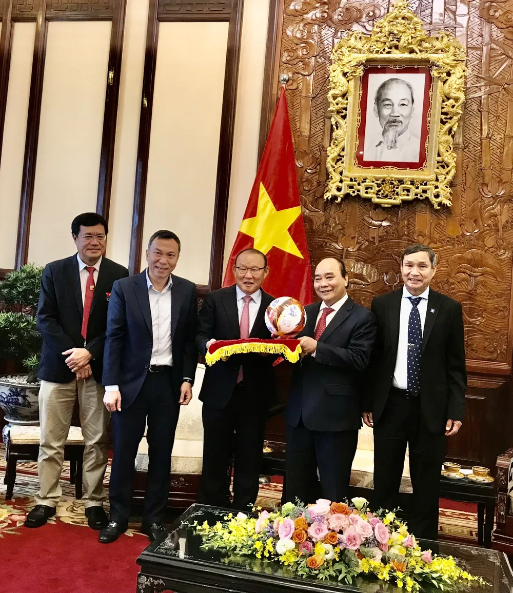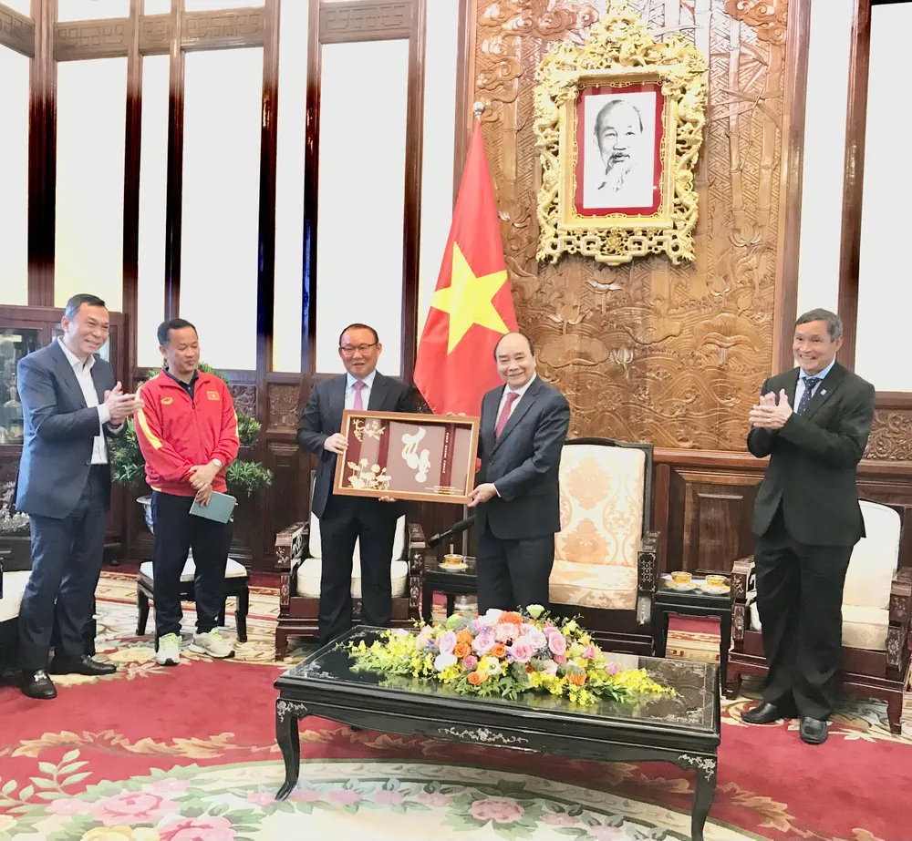 Chủ tịch nước Nguyễn Xuân Phúc trao tặng bức chân dung cho huấn luyện viên Mai Đức Chung
