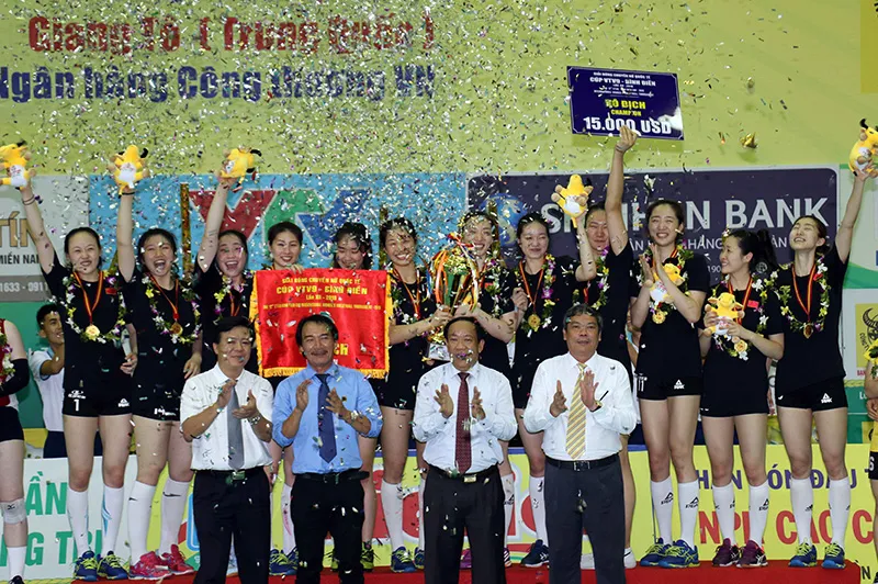 Ông Ngô Văn Đông (trái) và lãnh đạo tỉnh Quảng Nam trao Cúp vô địch cho CLB Giang Tô. Ảnh: DŨNG PHƯƠNG
