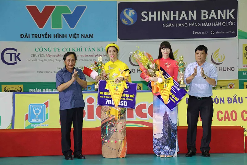 Trà Giang và Sabina nhận giải VĐV mặc áo dài đẹp nhất. Ảnh: DŨNG PHƯƠNG