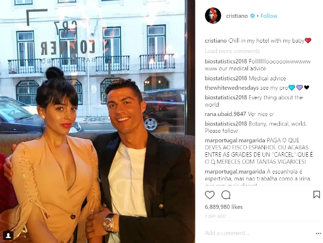 Cũng trên mạng xã hội Instagram, ngôi sao Cristiano của Real Madrid đã vừa đăng một bức ảnh tình tứ bên bạn gái Georgina Rodriguez. Địa điểm chụp bức ảnh này là khách sạn CR7 Pestana ở Bồ Đào Nha.
