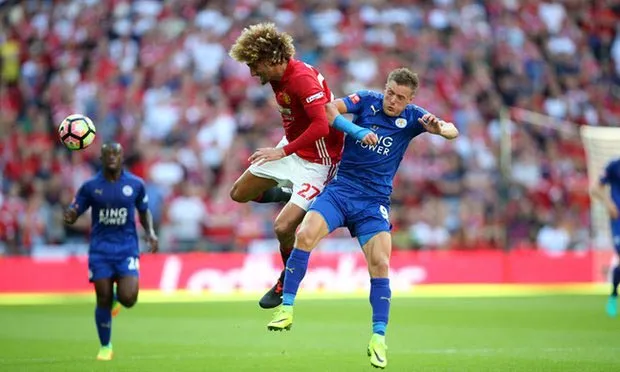 Jamier Vardy tranh bóng với Marouane Fellaini ở trận Community Shield