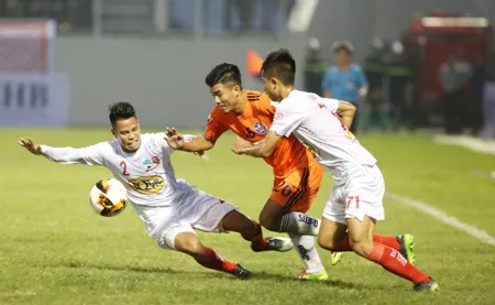 Các cầu thủ HAGL không thể cản bước Đà Nẵng (giữa) tìm đến chiến thắng Ảnh: T.L