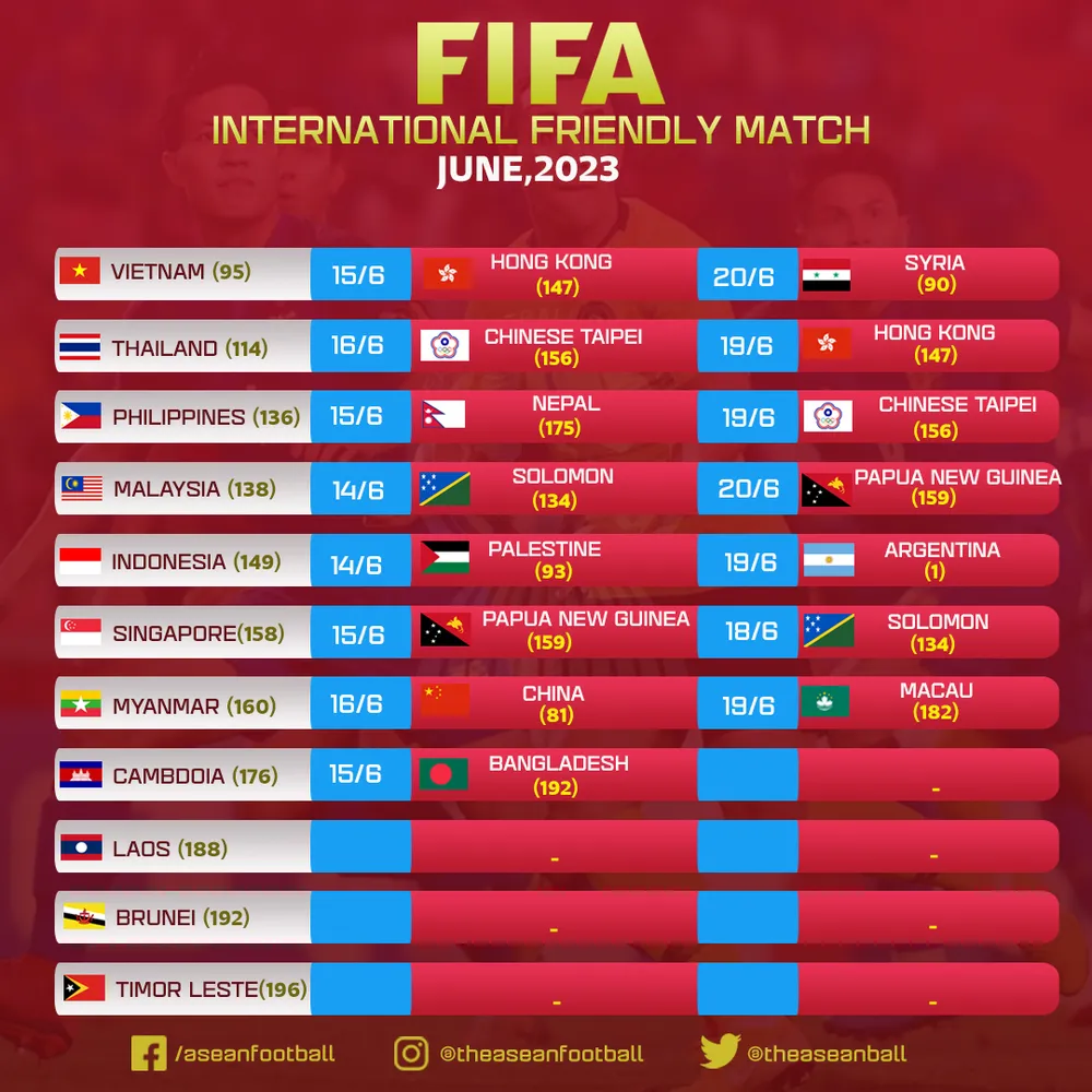Không chỉ đội tuyển Việt Nam thi đấu quốc tế trong dịp này để kiểm tra lực lượng, có thêm 7 đội khác thuộc khu vực Đông Nam Á cũng ra sân thi đấu trong tháng 6/2023. Có đội chọn đối thủ nhẹ để thi đấu như Philippines, Malaysia. Nhưng có đội gây sự chú ý khi mời đội tuyển Argentina sang tranh tài như Indonesia.