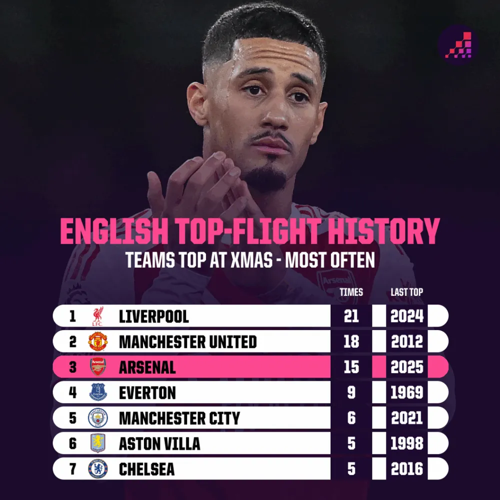 Lần thứ năm trong kỷ nguyên Premier League, Arsenal ngự trị trên đỉnh bảng vào ngày 25-12. Tuy nhiên, lịch sử lại đang kể một câu chuyện nhuốm màu bi kịch cho những người yêu mến sắc đỏ trắng vùng Bắc London. Trong bốn lần trước đó (2002, 2007, 2022 và 2023), Arsenal đều kết thúc mùa giải với tư cách kẻ về nhì hoặc ba. Thậm chí, nếu nhìn rộng ra toàn bộ lịch sử hạng đấu cao nhất nước Anh, lần cuối cùng Arsenal lên ngôi vô địch sau khi dẫn đầu vào dịp Giáng sinh đã là từ năm 1947-48. Đã gần 80 năm, "ngôi quán quân mùa đông" chưa bao giờ là điềm lành đối với họ.