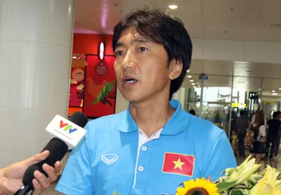 HLV Miura trả lời phỏng vấn báo chí tại sân bay Nội Bài. Ảnh: VFF