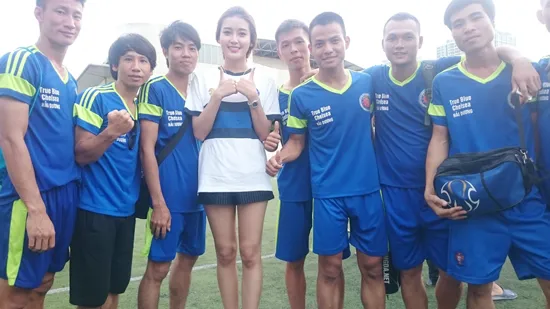 Anh Nguyễn Đức Thọ – tác giả của bài hát “Tôi yêu Chelsea” (đứng thứ 2 từ trái qua) – cùng CFC Hải Dương chụp hình chung với Á hậu Huyền My.
