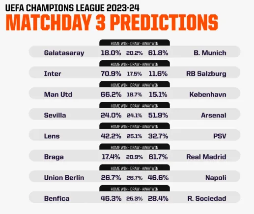 Galatasaray đã gây ra một trong những cú sốc lớn nhất của mùa giải UCL cho đến nay với chiến thắng 3-2 trước Man Utd ở lượt 2 và sẽ tìm cách có chiến thắng liên tiếp trong giải đấu lần đầu tiên kể từ tháng 12 năm 2012. Tuy nhiên, họ sẽ phải làm một điều mà họ chưa từng làm trước đây: thắng một trận sân nhà ở Champions League trước Bayern Munich, đội mà họ từng thua hai và hòa ba trong các lần gặp trước. Đội bóng Thổ Nhĩ Kỳ đã có 5 bàn thắng trong giải đấu mùa này được ghi bởi 5 cầu thủ khác nhau. Vấn đề là đối thủ của họ, Bayern Munich đã thắng 5 lần gần nhất khi đối đầu với các đội đến từ Thổ Nhĩ Kỳ, tổng tỷ số là 18-1. Thế nên siêu máy tính Opta chỉ đánh giá Galatasaray có khoảng 18% so với 61,9% của Bayern. Opta cũng mang lại cho Inter Milan cơ hội chiến thắng cao nhất trong 8 trận đấu diễn ra ngày thứ Ba, với 70,9% trước Salzburg. Inter đang có chuỗi 6 trận bất bại trên sân nhà tại Champions League (thắng 5) và giữ sạch lưới trong cả 5 trận thắng trong chuỗi trận này.