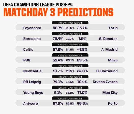 Newcastle là chú ngựa ô sẽ tiến xa ở Champions League mùa này và đã gửi một thông điệp nghiêm túc với chiến thắng 4-1 trước PSG tại St James' Park. Thử thách tiếp theo của họ là trận đấu trên sân nhà với Borussia Dortmund với 51,7% cơ hội chiến thắng từ Opta. Dortmund có nhiều hơn 14 cú sút so với Newcastle (32-18) trong hai trận đấu mở màn mùa giải 2023-24, nhưng đội bóng Đức vẫn chưa ghi bàn trong khi Những chú chim chích chòe có tỷ lệ chuyển đổi cú sút cao thứ hai giải đấu (22,2 %). Dortmund cũng đã thua sáu trận sân khách liên tiếp gần nhất trước các đối thủ đến từ Anh, giờ sẽ là thời điểm tốt để họ chấm dứt chuỗi trận đó.