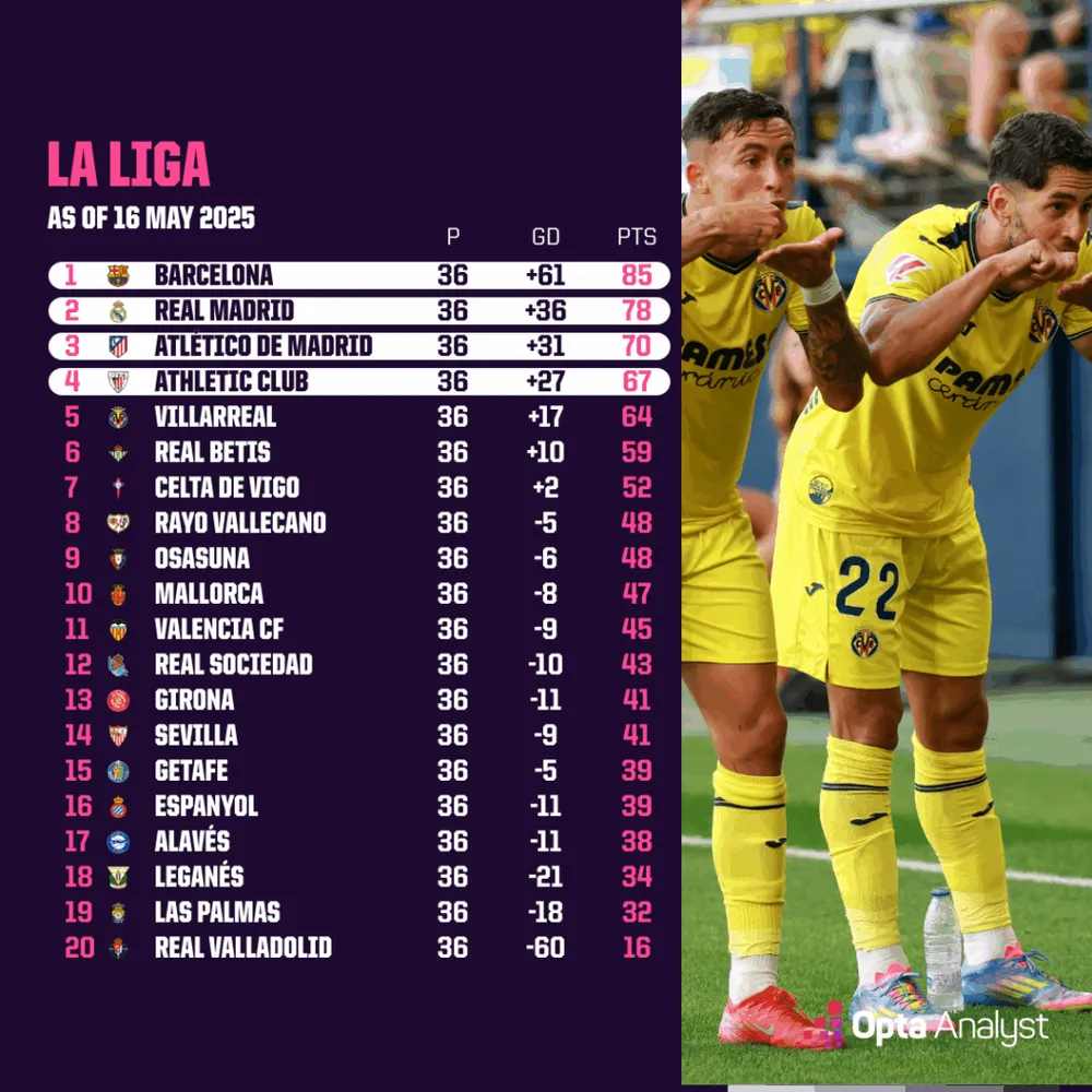 Barcelona đã giành chức vô địch La Liga thứ 28 với chiến thắng 2-0 trên sân Espanyol vào thứ Năm, trong khi Real Madrid, Atlético Madrid và Athletic Club cũng đã chắc chắn về mặt toán học nằm trong top 5.
