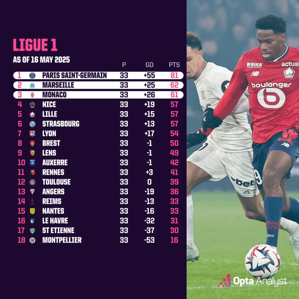 Paris Saint-Germain vẫn còn mục tiêu ở giải đấu mùa này khi chuẩn bị đối đầu Inter trong trận chung kết tại Munich, và họ chắc chắn sẽ trở lại Champions League mùa tới sau khi dễ dàng vô địch Ligue 1. Vòng đấu áp chót hồi tuần trước của giải đấu hàng đầu Pháp chứng kiến Marseille và Monaco lần lượt đánh bại Le Havre và Lyon để đảm bảo vị trí trong top 3.