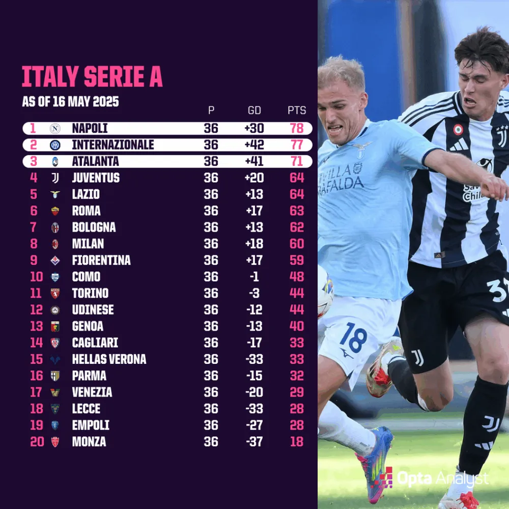 Hiệu số bàn thắng của Juventus tốt hơn Lazio 7 bàn, vì vậy hai chiến thắng trong hai trận cuối sẽ đủ để đội bóng của HLV Igor Tudor giành vé. Họ sẽ tiếp Udinese trên sân nhà trước khi làm khách tại Venezia vào ngày cuối cùng, trong khi Lazio phải đối mặt với chuyến làm khách khó khăn đến sân của Inter đang tranh chức vô địch vào cuối tuần, tiếp theo là trận sân nhà với Lecce.