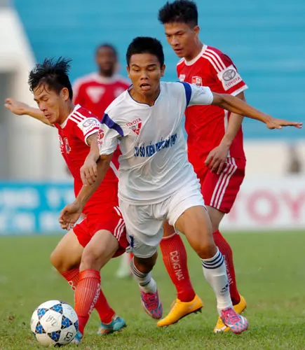 Các cầu thủ Đồng Nai và XSKT Cần Thơ (giữa) đang cố thoát khỏi khu vực đèn đỏ ở cuối bảng xếp hạng. Ảnh: Nguyễn Nhân