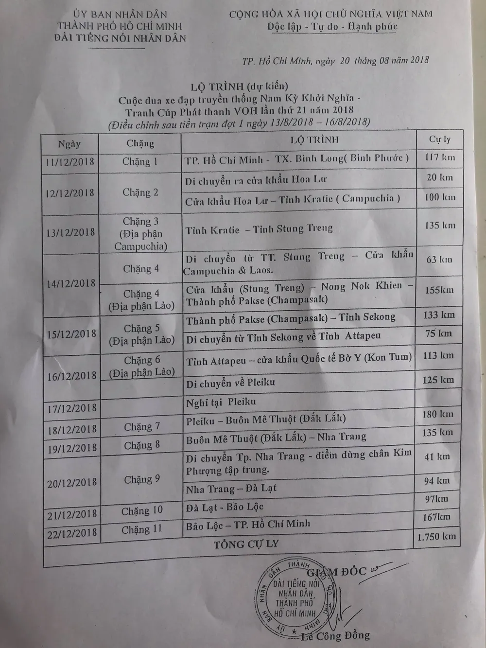 Trong cuộc họp báo vào sáng nay tại trụ sở của VOH nhằm lấy ý kiến của giới truyền thông cũng như các bộ phận liên quan nhằm tổ chức tốt hơn cho cuộc đua mang tính đột phá trong 21 lần tổ chức, Đài Tiếng nói Nhân dân TPHCM cho biết lộ trình giải năm nay sẽ đi qua 3 nước Đông Dương dự kiến diễn ra từ ngày 10-12 đến ngày 22-12.