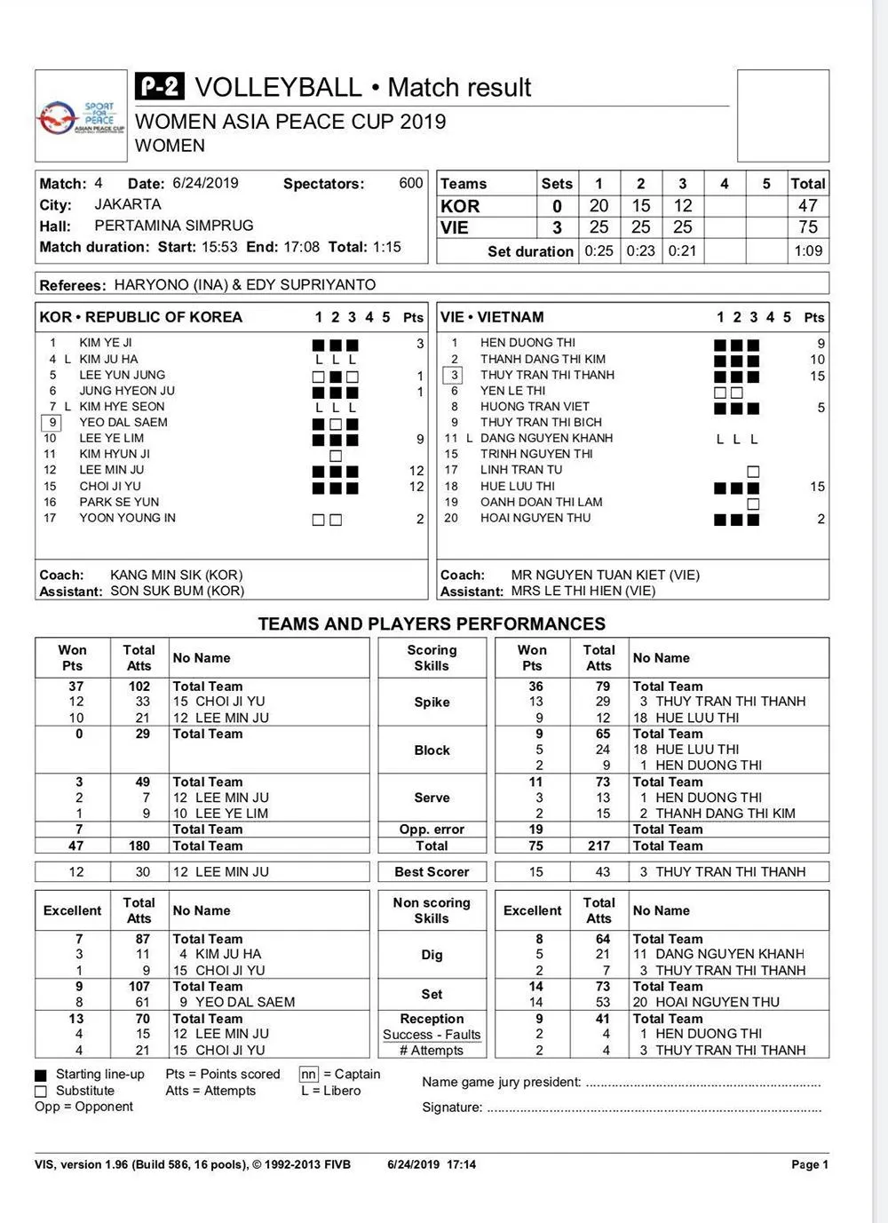 Xuất phát với đội hình gồm chuyền 2 Nguyễn Thu Hoài, cặp chủ công Thanh Thuý, Dương Thị Hên, đối chuyền Kim Thanh, cặp phụ công Lưu Thị Huệ và Trần Việt Hương (libero là Khánh Đang), U.23 Việt Nam chơi rất kín kẽ, công tốt mà thủ cũng hay, tạo được áp lực lớn đối với đội bóng đến từ Hàn Quốc.
