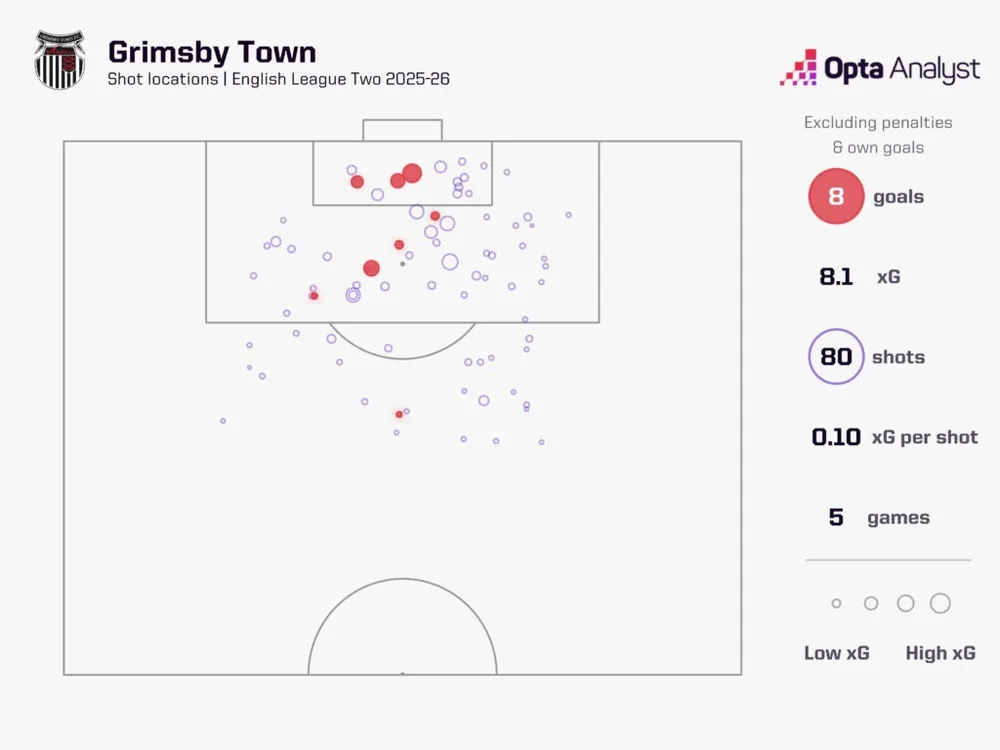 Grimsby Town thể hiện phong cách chơi tấn công đầy quyết liệt trong mùa giải này. Họ dẫn đầu League Two với 80 cú sút không tính phạt đền và ghi được 8,1 xG (chỉ số bàn thắng kỳ vọng) – chỉ kém Crewe Alexandra (9,4). Đội bóng cũng có 156 lần chạm bóng trong vòng cấm đối phương, góp phần giúp họ nhận được ba quả phạt đền – nhiều nhất giải. Tổng cộng, Grimsby đã giành được năm quả phạt đền trong sáu trận trên mọi đấu trường, một con số ấn tượng.