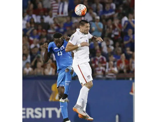 Clint Dempsey (áo trắng, tuyển Mỹ) trong pha tranh chấp với Johnny Palacios của Honduras. Ảnh: AP.