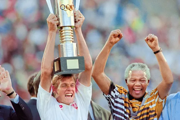 Tovey nâng cúp bên cạnh cố Tổng thống Nelson Mandela.