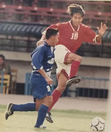 Quang Sang (10) tranh bóng cùng Xuân Trúc trong trận tranh play-off cùng Hải Quan năm 1998.
