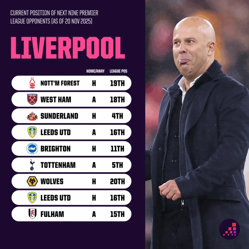 May mắn cho Liverpool, lịch thi đấu phía trước có phần "dễ thở" hơn. Trong năm trận sắp tới, họ chỉ đối đầu với một đội nằm ở nửa trên bảng xếp hạng (Sunderland, một đội thăng hạng). Bắt đầu bằng trận đấu trên sân nhà với Nottingham Forest (hạng 19), đây là cơ hội vàng để Slot và các học trò khởi động lại cỗ máy.