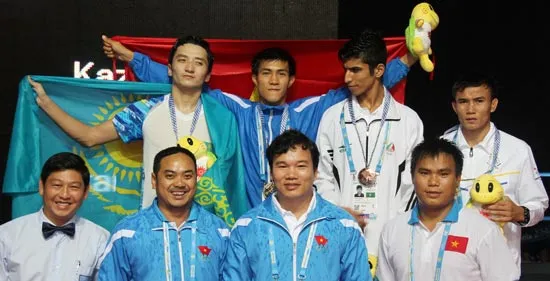 Nguyễn Trần Duy Nhất (giữa hàng trên) xuất sắc hạ gục đối thủ Kazakhstan giành chiếc HCV.