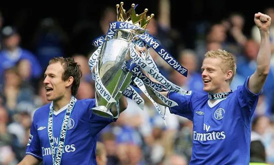 Damien Duff (phải) ăn mừng chức vô địch Premier League trong màu áo Chelsea.