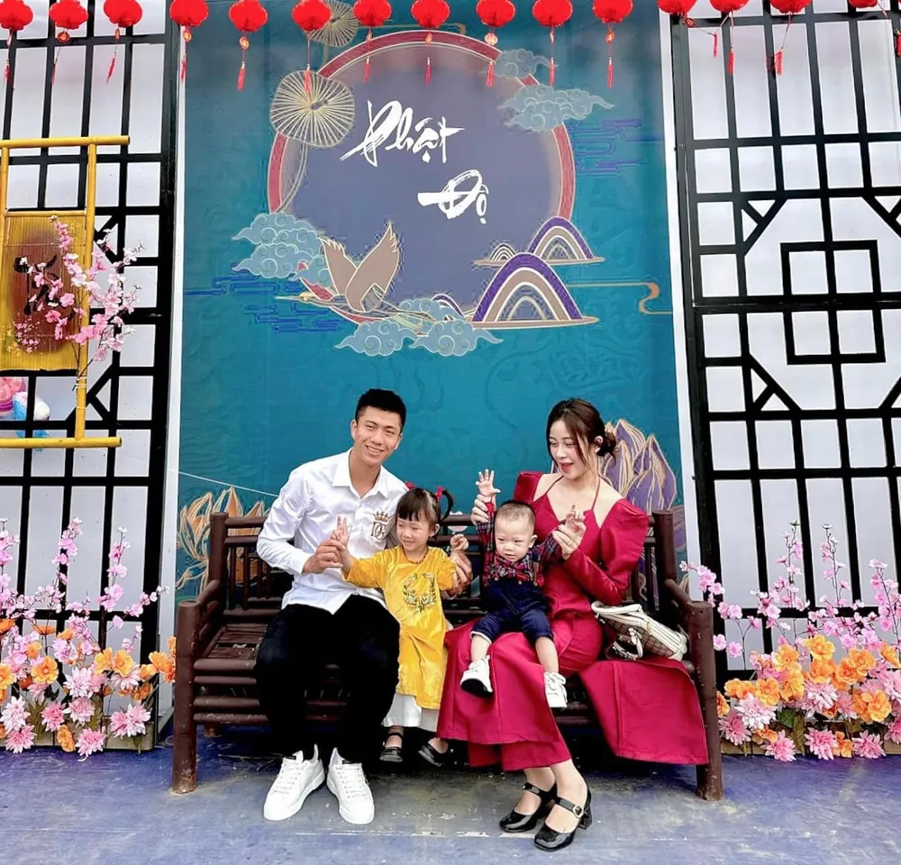 Tiền vệ đội trưởng Đỗ Hùng Dũng chụp ảnh đầu năm cùng bà xã Triệu Mộc Trinh và cậu quý tử. Không giống Ngọc Hải, Dũng “Chíp” phải hội quân cùng Hà Nội FC sớm, vào ngày 24-1, tức mùng 3 Tết để chuẩn bị cho trận Siêu Cúp quốc gia 2023 với Hải Phòng. Trận đấu mở màn mùa giải 2023 được diễn ra vào lúc 16g45 trên sân Hàng Đẫy vào ngày 29-1 (tức mùng 8 Tết).