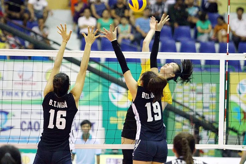 Chủ công Trần Thị Thanh Thuý và pha xử lý bóng trước hàng chắn Thông tin LVPB. Ảnh: DŨNG PHƯƠNG