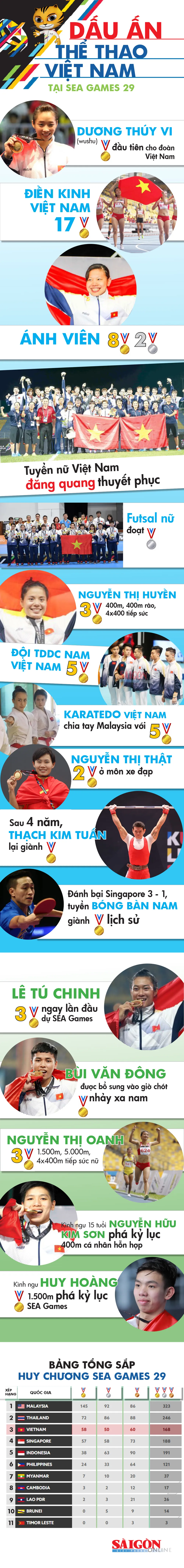 SEA Games 29 sẽ chính thức hạ màn vào tối nay (30-8) với lễ bế mạc diễn ra từ 19 giờ đến 21 giờ 30 (giờ Việt Nam) tại sân vận động Bukit Jalil. Sau gần 3 tuần đua tranh với nhiều cung bậc cảm xúc, có thể nói đây là một mùa SEA Games thành công của Việt Nam. Hãy cùng điểm qua những dấu ấn của thể thao Việt Nam tại SEA Games 29.