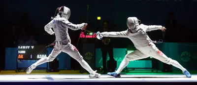 Vũ Thành An (phải) là kiếm thủ có triển vọng nhất của đấu kiếm Việt Nam trong hành trình tìm vé đi Olympic 2016 Ảnh: Dũng Phương