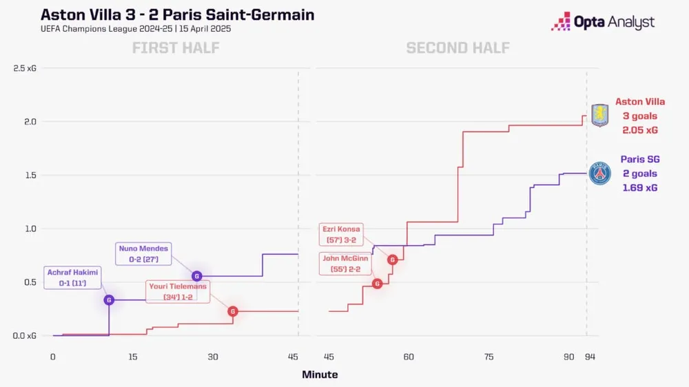PSG chơi với hàng phòng ngự dâng cao và trông lúng túng khi Villa lao thẳng vào họ. Ngay cả khi John McGinn, người không nổi tiếng về tốc độ hay kỹ năng rê bóng, bứt phá qua trung tuyến, hàng thủ PSG chỉ biết lùi dần cho đến khi McGinn tung cú sút ghi bàn thứ hai cho Villa. Nhìn chung, PSG đã thể hiện một màn trình diễn thiếu chắc chắn, không kiểm soát và kém áp đảo so với phong độ gần đây của họ – cũng như màn trình diễn ở lượt đi. Họ đi tiếp với tổng tỷ số 5-4, nhưng căng thẳng hơn nhiều so với những gì họ mong muốn.
