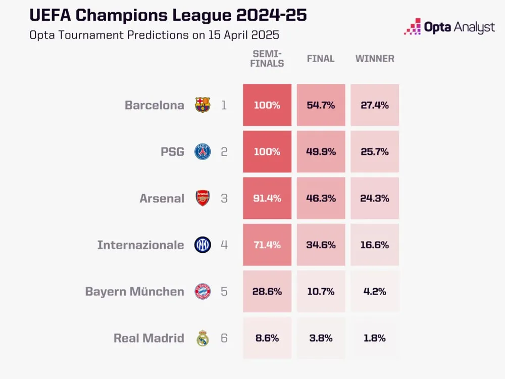Cả hai đội đều bước vào trận lượt về tứ kết với lợi thế lớn từ lượt đi. PSG đã đánh bại Aston Villa 3-1 tại Paris tuần trước, trong khi Barcelona thắng đậm Borussia Dortmund 4-0 trên sân nhà. Mỗi cặp đấu gần như đã an bài, và siêu máy tính Opta cũng đồng tình. Trong 10.000 mô phỏng trận đấu được chạy ngay trước giờ bóng lăn vào thứ Ba, PSG đi tiếp trong 91,5% trường hợp, còn Barcelona là 99,4%. Với sự vượt trội như vậy, đối thủ của họ gần như không có cơ hội lật ngược tình thế.