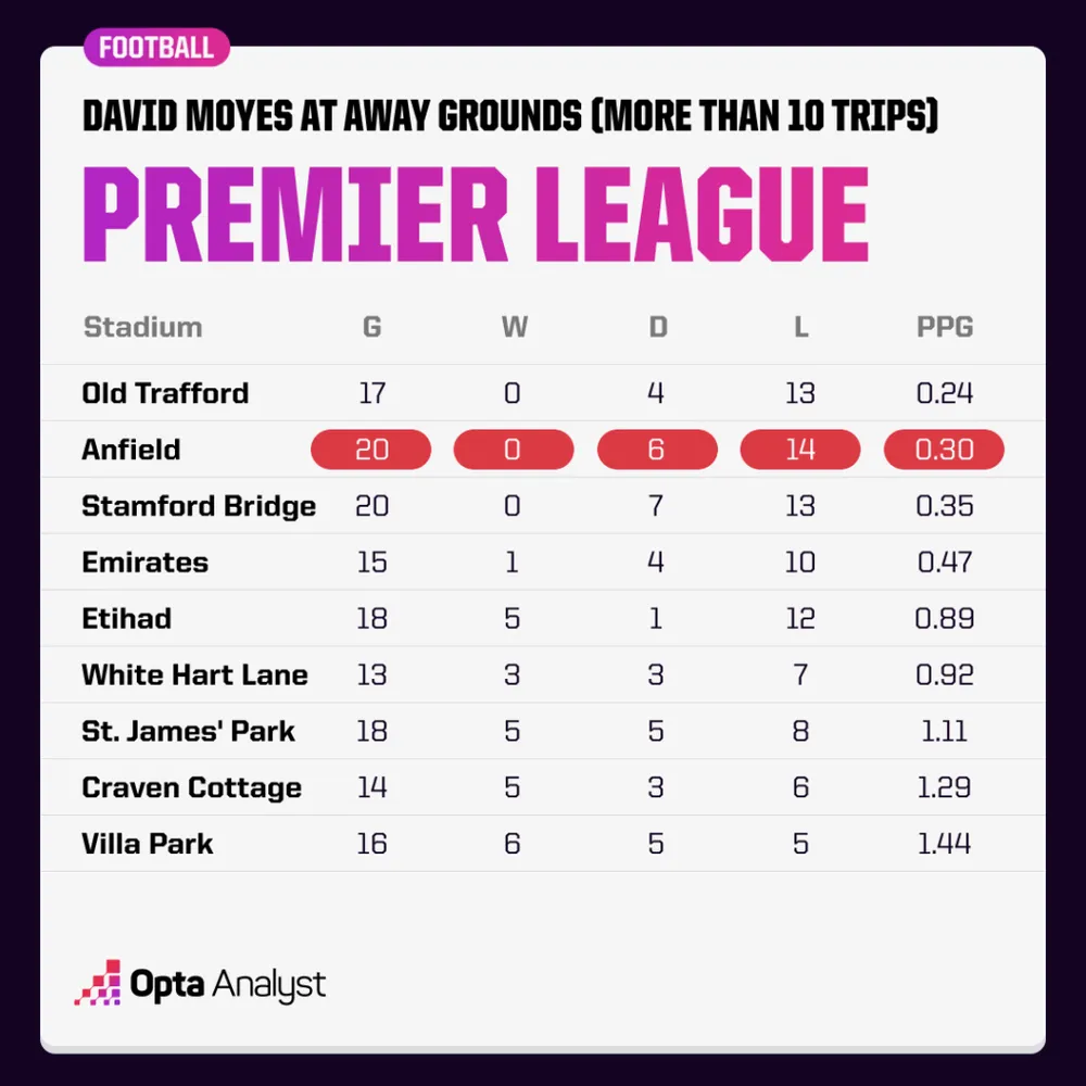 HLV David Moyes chưa từng thắng tại Anfield sau 20 trận Premier League, chỉ kiếm được 6 điểm từ 60 điểm tối đa – kỷ lục tệ nhất của một HLV tại một sân đấu. Kỷ luật là vấn đề lớn, với Everton nhận 11 thẻ đỏ dưới thời Moyes trong các trận derby Merseyside, nhiều nhất trong lịch sử Premier League.