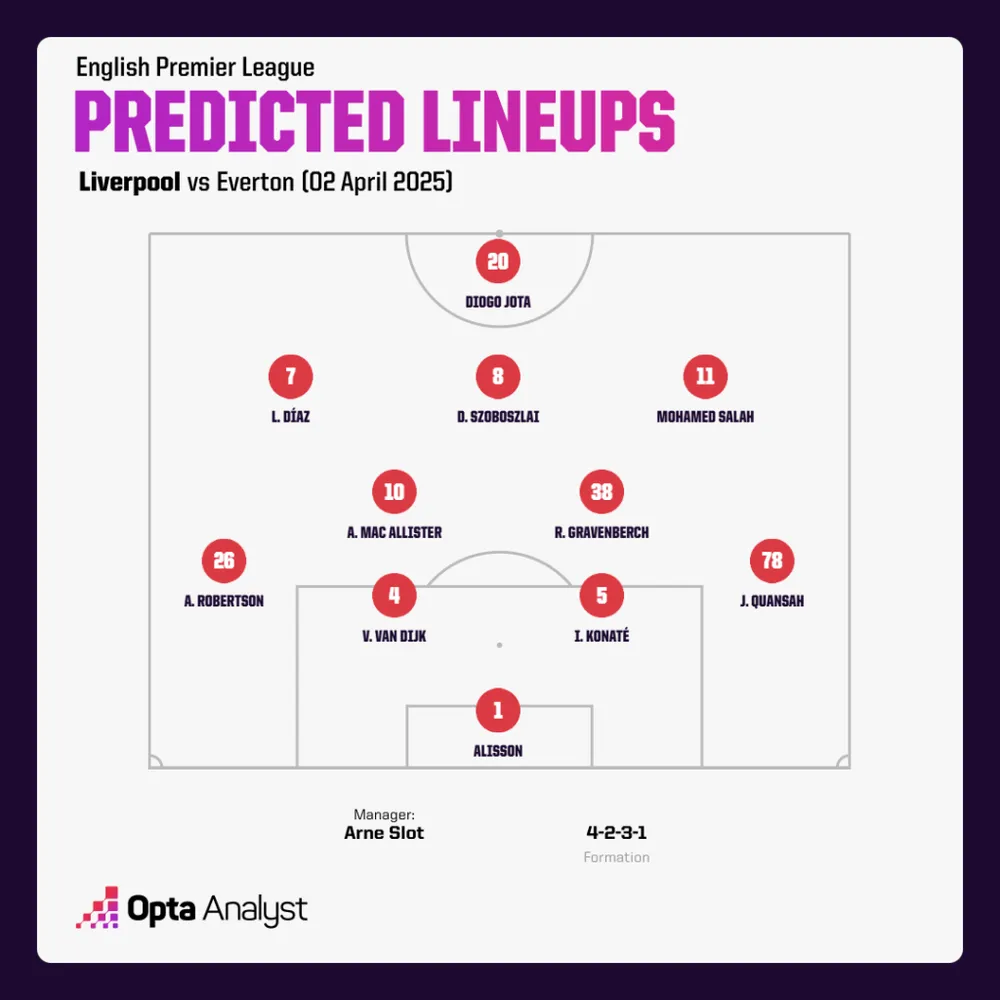 Đội chủ nhà đã chứng kiến Alisson và Ryan Gravenberch trở lại câu lạc bộ sớm từ kỳ nghỉ quốc tế vì chấn thương, dù cả hai dự kiến sẽ sẵn sàng cho trận này. Conor Bradley đã trở lại tập luyện nhưng trận đấu có thể đến quá sớm với anh, vì vậy Jarell Quansah có thể tiếp tục chơi ở vị trí hậu vệ phải khi Trent Alexander-Arnold vắng mặt vì chấn thương.