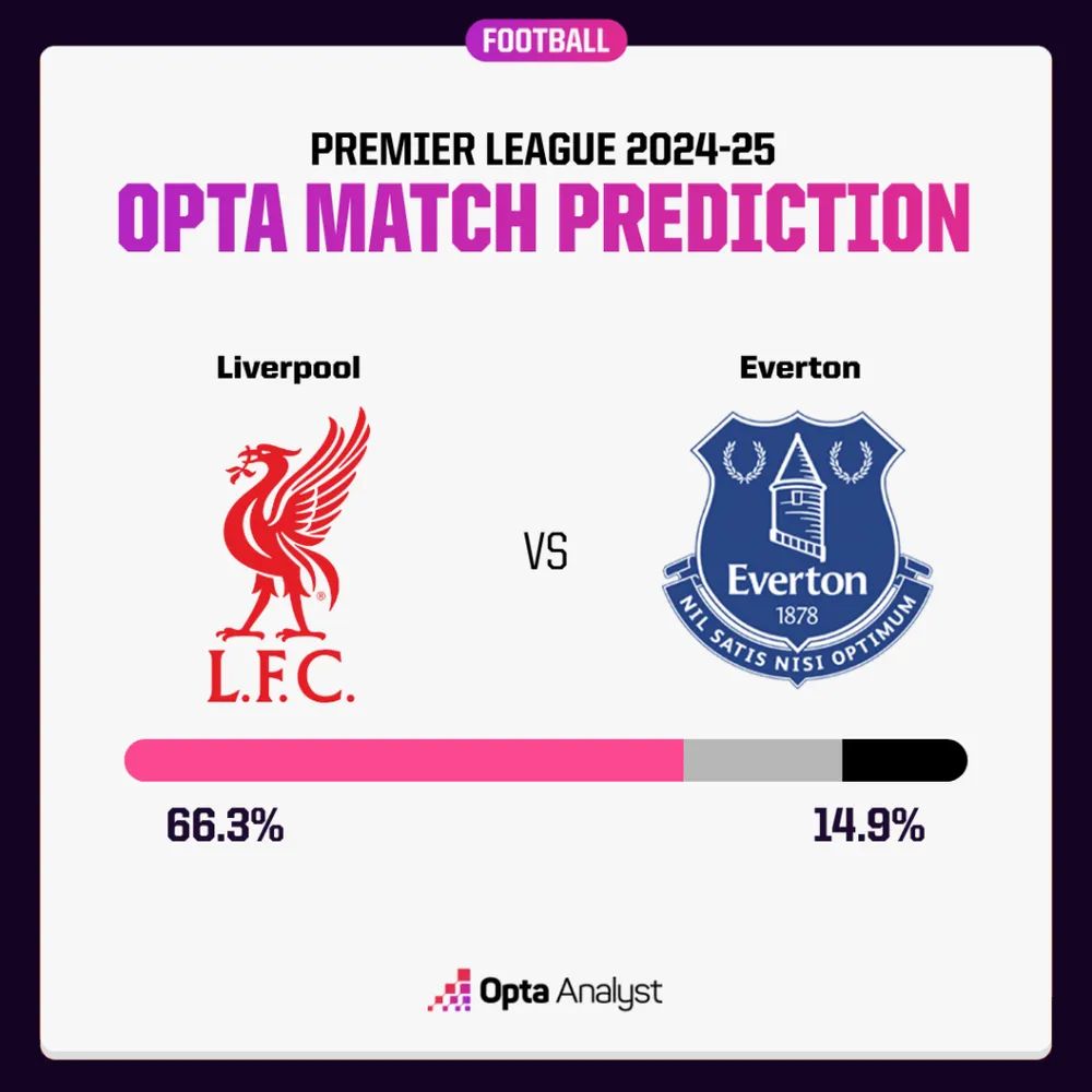 Theo máy tính Opta, xác suất thắng của Liverpool đạt mức cao 66,3%, trong khi Everton chỉ được đánh giá có 14,9% cơ hội giành 3 điểm.