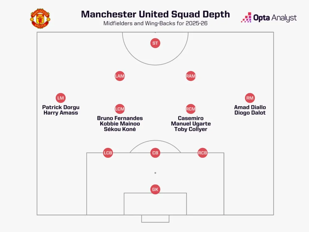 Hàng thủ có thể tạm ổn, nhưng tuyến giữa chắc chắn cần được cải thiện, bao gồm cả vị trí hậu vệ cánh. Khi các lựa chọn ở cánh khỏe mạnh vào mùa trước, Diogo Dalot là lựa chọn số một ở vị trí hậu vệ cánh phải, dù Mazraoui và Amad Diallo cũng từng chơi ở đó. Dalot là một hậu vệ phải ổn định, nhưng nhiều người nghi ngờ khả năng chơi hậu vệ cánh của anh do thiếu tốc độ và không thường xuyên tham gia tấn công. Dù vậy, anh nhận thức được điều này và đang cố gắng cải thiện.