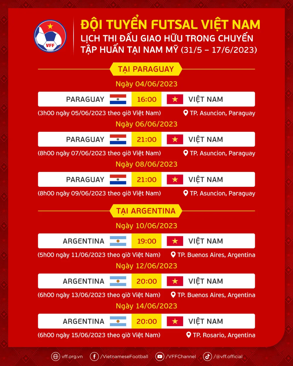 Đội tuyển Futsal Việt Nam sẽ duy trì cường độ tập luyện 2 buổi 1 ngày, sáng tập vận động và chiều tập kỹ chiến thuật trong những ngày tới. Về lịch thi đấu giao hữu của đội cũng có điều chỉnh về giờ bóng lăn ở một số trận đấu theo thống nhất mới đây giữa LĐBĐ Paraguay và LĐBĐ Việt Nam.