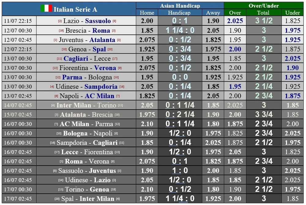 Juventus vừa bị AC Milan lội ngược dòng đá bại 2-4 nhưng vẫn giữ nguyên vị trí đầu bảng Serie A sau 31 vòng đấu với 75 điểm, hơn đội nhì bảng Lazio 7 điểm và hơn Atalanta 9 điểm. Nếu xét phong độ thi đấu kể từ khi Serie A trở lại thì không đội bóng nào ở Ý bằng với Atalanta với 6 trận toàn thắng. Nếu tính xa hơn chút nữa thì Atalanta đã có 9 trận toàn thắng liên tiếp.