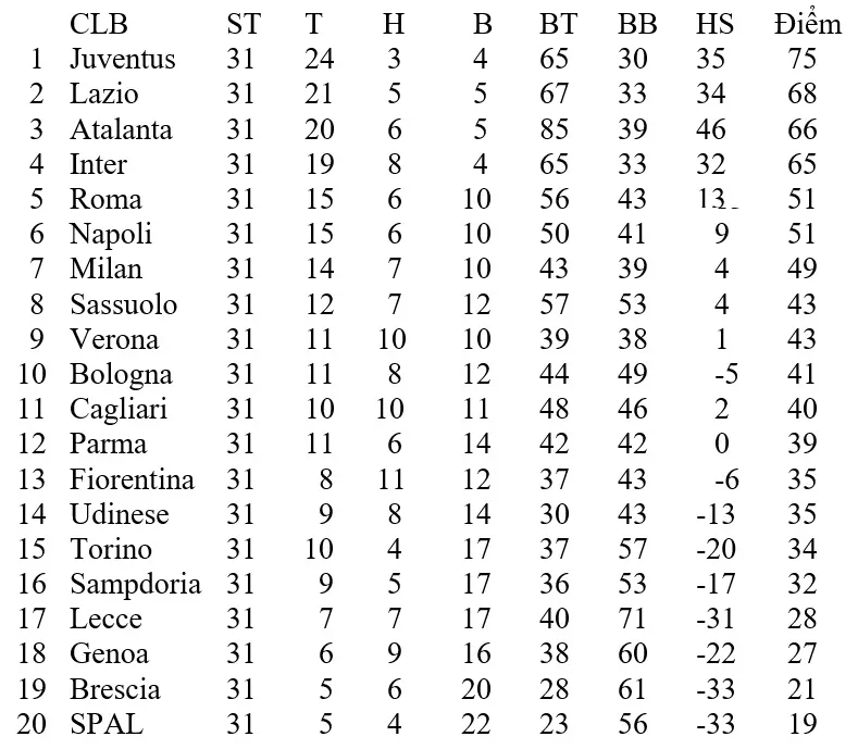 Cái tên Atalanta trở nên nổi bật hơn khi chiếm được vị trí thứ 3 của Inter Milan sau những trận hòa đáng tiếc, trong khi đó Lazio liên tiếp thua trận. Giới bình luận nhận định Atalanta có thể là kẻ thách thức Juventus vào lúc này dù thua tới 3 trận thắng. HLV Gian Piero Gasperini gạt chuyện bốc thăm Champions League gặp PSG ở tứ kết để tập trung vào Serie A. Ông bảo rằng mục tiêu của đội là duy trì vị trí trong top tư để có suất dự Champions League mùa giải kế tiếp nhưng đấy là lời nói khiêm tốn. Atalanta là đội bóng có hàng công khủng nhất Serie A hiện tại với 85 bàn thắng, trong khi Juventus có những siêu sao như Cristiano Ronaldo, Paulo Dybala chỉ có 65 bàn thắng. Hàng thủ của Atalanta cũng cải thiện rất tốt trong 3 trận gần đây đều không để thủng lưới lần nào.