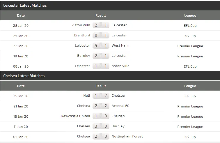 Leicester có niềm tin vào cuộc hò hẹn này khi bất bất bại trong 4 lần chạm trán Chelsea gần đây (thắng1, hòa 3). Nhưng Chelsea đang là bậc thầy chơi sân khách khi thắng 5 trong 7 chuyến du hành đến sân King Power (hòa 1 và thua 1) và thực tế là không đội bóng nào thắng ở sân King Power nhiều hơn Chelsea.