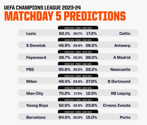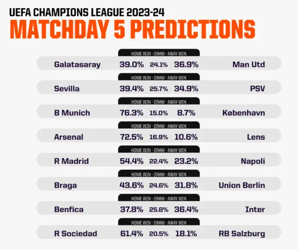 Đội bóng có tỷ lệ thắng trận lớn nhất chính là Bayern Munich với 76,3% khi họ tiếp Copenhagen ở lượt đấu diễn ra vào rạng sáng thứ Năm (giờ Việt Nam). Đây là trận sân nhà đầu tiên của Bayern gặp một đội bóng Đan Mạch tại Champions League kể từ khi đánh bại Brondby vào tháng 11 năm 1998. Tậm điểm của bảng A là trận Galatasaray tiếp Man.United. Đội của Erik ten Hag sẽ cần ít nhất một trận hòa để duy trì cơ hội lọt vào vòng tiếp theo. Họ xếp cuối bảng A trước chuyến làm khách tới Istanbul gặp Galatasaray, nhưng theo máy tính thì Galatasaray mới là người có cơ hội chiến thắng cao nhất (39%). Đây sẽ là lần thứ tám Galatasaray tiếp đón đối thủ Anh ở Champions League; họ chỉ thua hai trong số bảy trận trước đó.