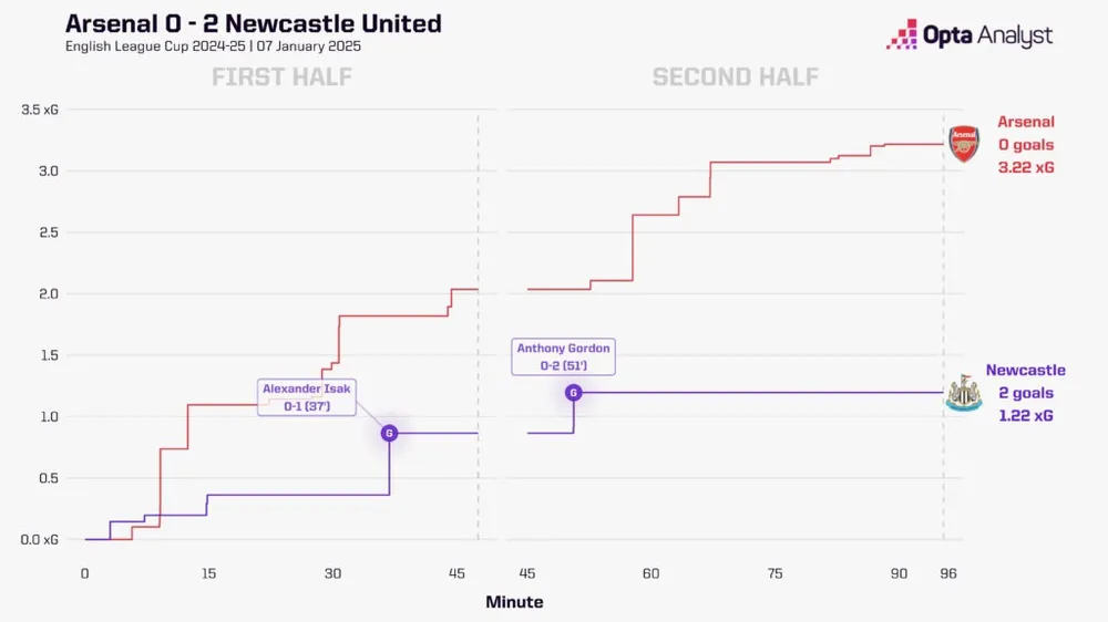 Arsenal đã thua 0-2 ở trận lượt đi trước Newcastle vào tháng trước dù có tới 23 cú sút và đạt tổng xG – bàn thắng dự kiến - là 3.2. Họ cũng thua 0-1 tại St James’ Park ở Premier League vào tháng 11. Trong thế kỷ 21, Arsenal mới chỉ ba lần không thể ghi bàn trong ba trận đấu với cùng một đối thủ trong một mùa giải (Liverpool mùa 2021-22, Chelsea mùa 2013-14 và Man Utd mùa 2004-05).