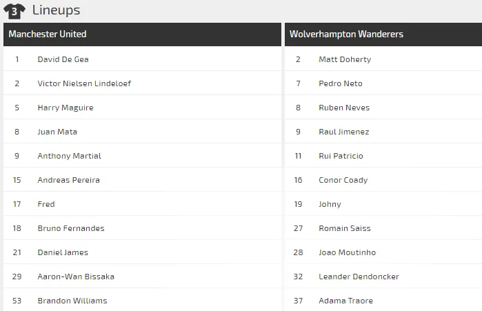 Trận này, ngoài Marcus Rashford (lưng), Paul Pogba (mắt cá), Scott McTominay (đầu gối) và Axel Tuanzebe đều đang dưỡng thương, trong lúc Nemanja Matic thụ án treo giò.