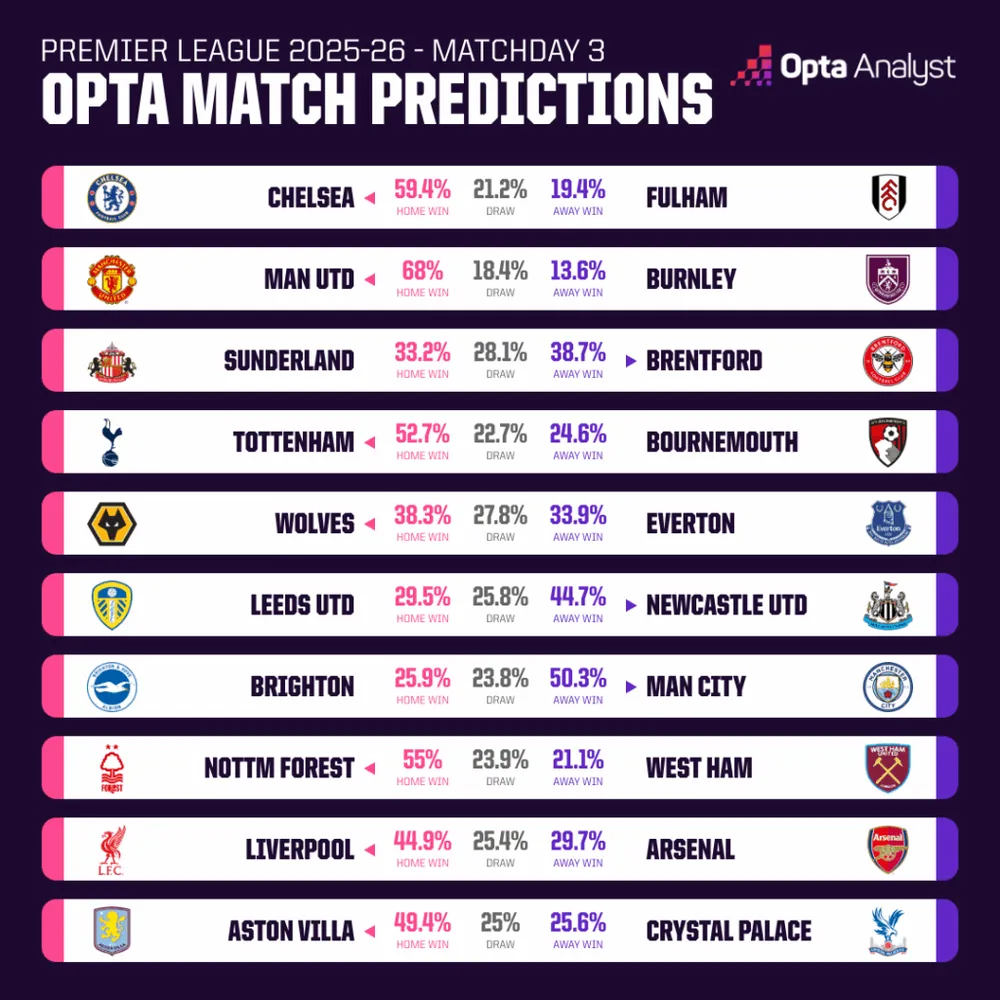 Mọi ánh nhìn sẽ đổ dồn về Anfield vào chiều Chủ nhật khi hai ứng cử viên vô địch tiềm năng, Liverpool và Arsenal, đối đầu trực tiếp, với cả hai đội đều đã thắng hai trận đầu mùa. Liverpool, đội giành chiến thắng kịch tính vào phút chót trước Newcastle vào thứ Hai, là đội được siêu máy tính Opta ưu ái hơn để tiếp tục mạch thắng với 44.9%, mặc dù họ không thắng trong sáu trận gần nhất tại giải đấu gặp Arsenal (H2 T4).