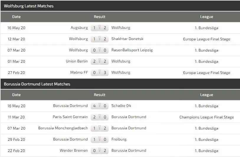 Wolfsburg bất bại trong 7 trận Bundesliga, nhưng Dortmund có phong độ còn tốt hơn khi thắng 8 trên 9 trận trong năm 2020. Wolfsburg đã ghi được 6 bàn nhưng để thủng lưới 8 bàn trên sân nhà.