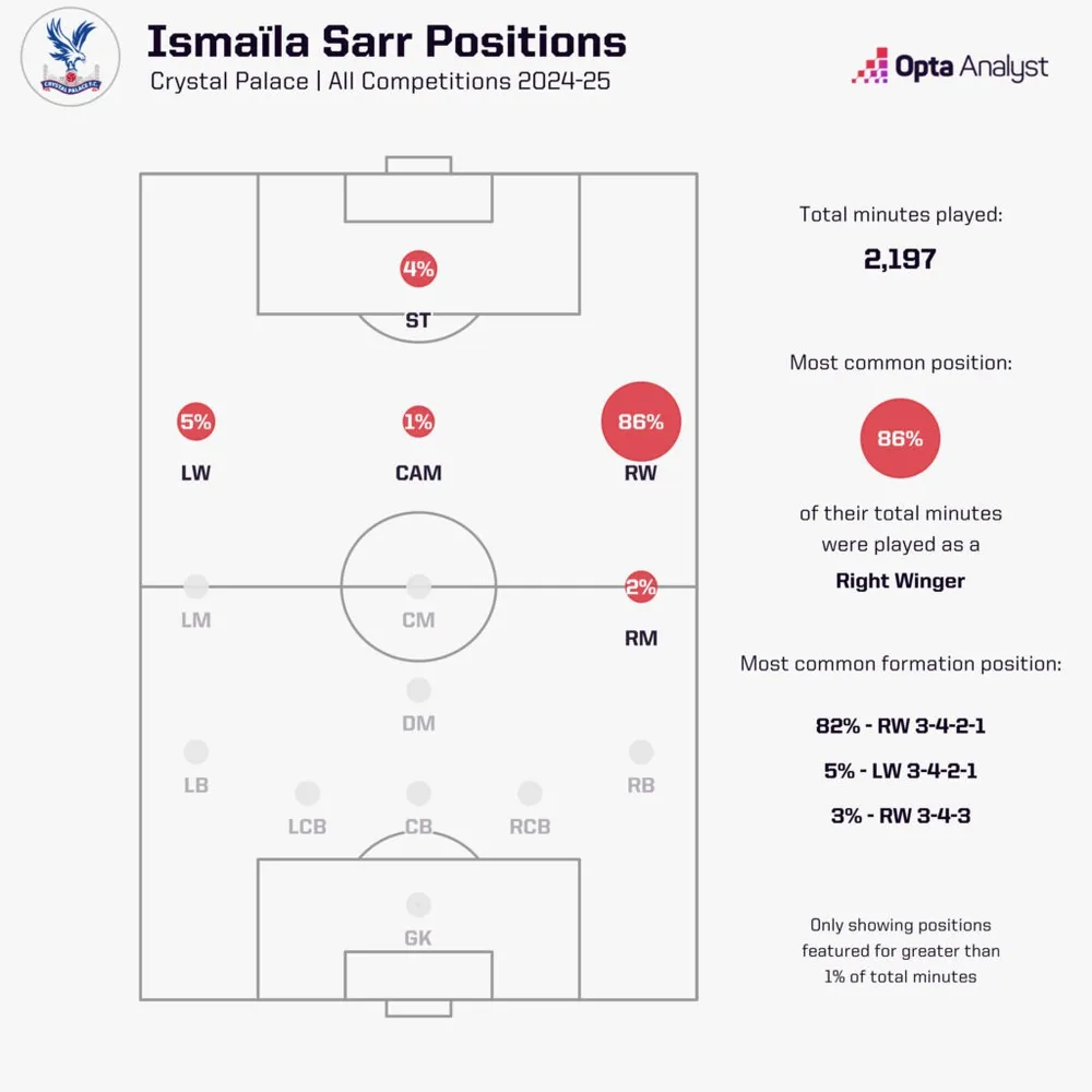 Việc anh được bố trí ở vị trí mạnh nhất của mình, cánh phải, cũng giúp ích rất nhiều. Trong tất cả các giải đấu mùa này, Sarr đã chơi 86% số phút của mình ở vị trí đó, phần lớn trong sơ đồ 3-4-2-1, tăng từ 50% số phút ở mọi giải đấu tại Marseille mùa trước.