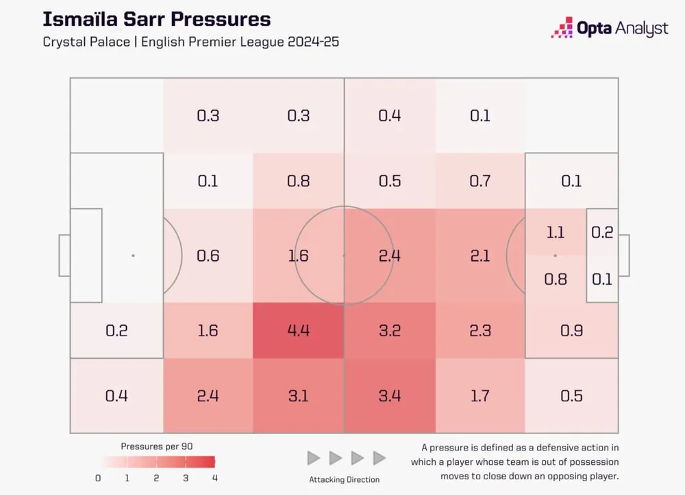Sarr là một phần không thể thiếu trong lối pressing của Palace. Chỉ Bruno Fernandes (447) gây áp lực ở khu vực giữa sân nhiều hơn Sarr tại Premier League mùa này (430), trong khi tính theo mỗi 90 phút, chỉ Dominic Solanke (22,5) vượt qua Sarr (20,0).